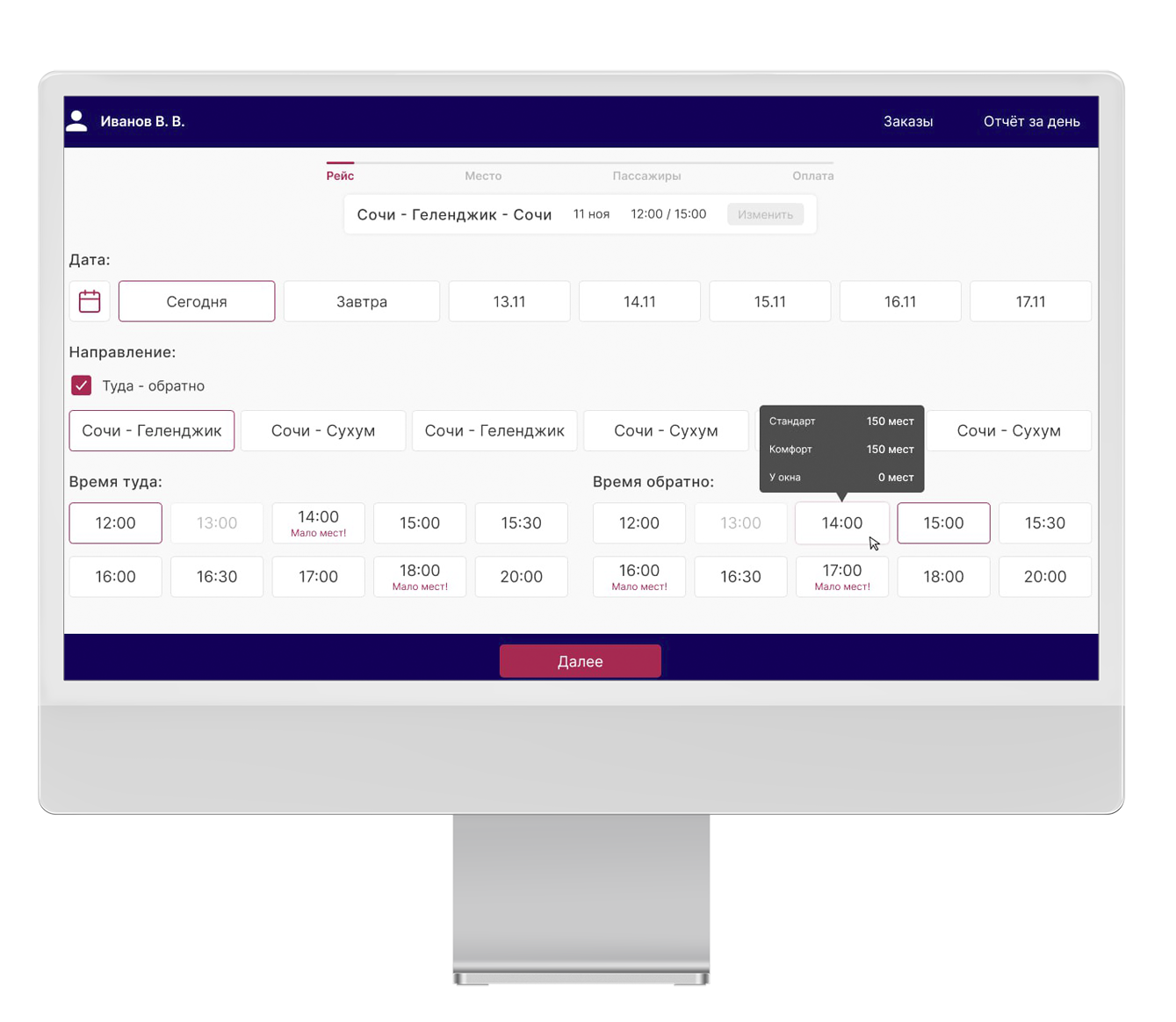 Интерфейс для продажи перевозок различного типа для агентов (ЛКА), менеджеров-кассиров, максимально адаптированный для работы не только на ПК, но и на мобильных устройствах, планшетах и соблюдения кассовой дисциплины.